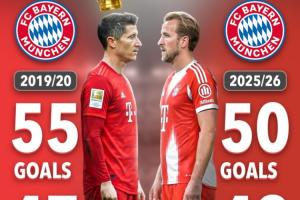 本赛季凯恩代表拜仁出战42场比赛,已经贡献50粒进球和6次助攻,距离莱万在拜仁的最佳赛季2019/20赛季创下的47场55球还有5球。