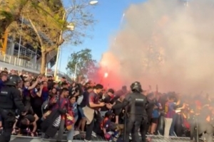 科贝:马竞大巴抵达诺坎普球场时再遭石块袭击,两扇车窗被砸碎