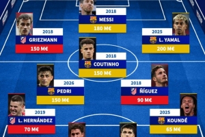 巴萨、马竞合体最贵阵:梅西、格列兹曼领衔,亚马尔、佩德里在列