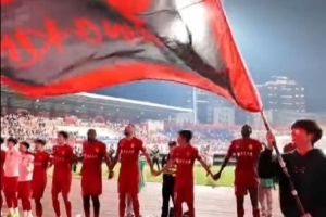 体育资讯4月11日讯 中超第5轮,重庆铜梁龙主场2-1击败武汉三镇,取得中超两连胜。赛后,本场比赛停赛的李镇全和没有上场的队长向余望现身球场,和队友一起与球迷互动,庆祝这场来之不易的胜利。